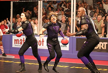 How would you characterize the style of humor in this movie? A) I think the movie is definitely a broad comedy but we did our best and I certainly did my best to make sure there’s a lot of different comedy throughout the whole movie. I’m kind of a comedy snob, which doesn’t mean I only like jokes about the quadratic equation. I like a good football in the groin. It just has to be done right. That’s what is important to me. Just the execution of different types of comedy that’s important, so for me I knew I was making a broad comedy about dodgeball, but I wanted it to be the kind of dodgeball movie that I’d want to go see. So at least hopefully, it’s really, really stupid and hopefully clever at times and kind of oddly charming. But the comedy, I think it runs a gamut between just the really asinine to the slightly tongue and cheek to even occasionally clever. So, for me, some of my favorite jokes in the movie aren’t people getting hit in the testicles and falling over, though I like those. There’s [sportscaster] Cotton McKnight says, “So don’t go anywhere folks because Darwin’s cruelest play is about to unfold here today. So don’t go anywhere folks the schadenfreude is about to begin.” That kind of stuff makes me laugh. And I think there’s a reference to Lewis Carrol in there. Just stuff to essentially impressive my English professor in college. So that’s essentially the idea, that it goes everywhere. If you like people getting hit with things and falling and hurting themselves, we’ve got that. If you like kind of smarty pants humor, we sort of feather that in every once in a while. And if you don’t get one joke it’s okay because the next joke is thirty seconds away.