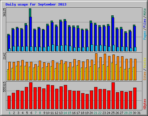 | Day | Hits | Files | Pages | Visits | Sites | KBytes | ||||||