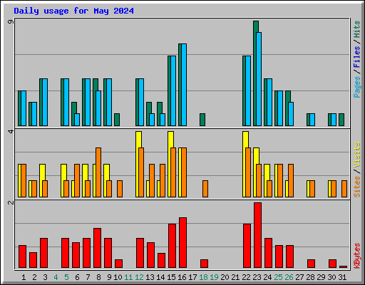 | Day | Hits | Files | Pages | Visits | Sites | KBytes | ||||||