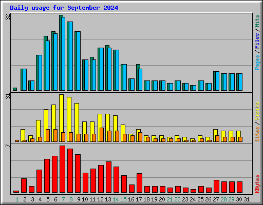 | Day | Hits | Files | Pages | Visits | Sites | KBytes | ||||||