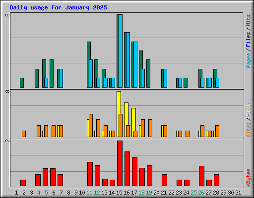 | Day | Hits | Files | Pages | Visits | Sites | KBytes | ||||||