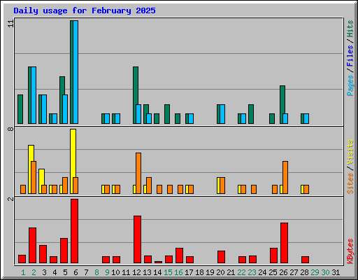 | Day | Hits | Files | Pages | Visits | Sites | KBytes | ||||||